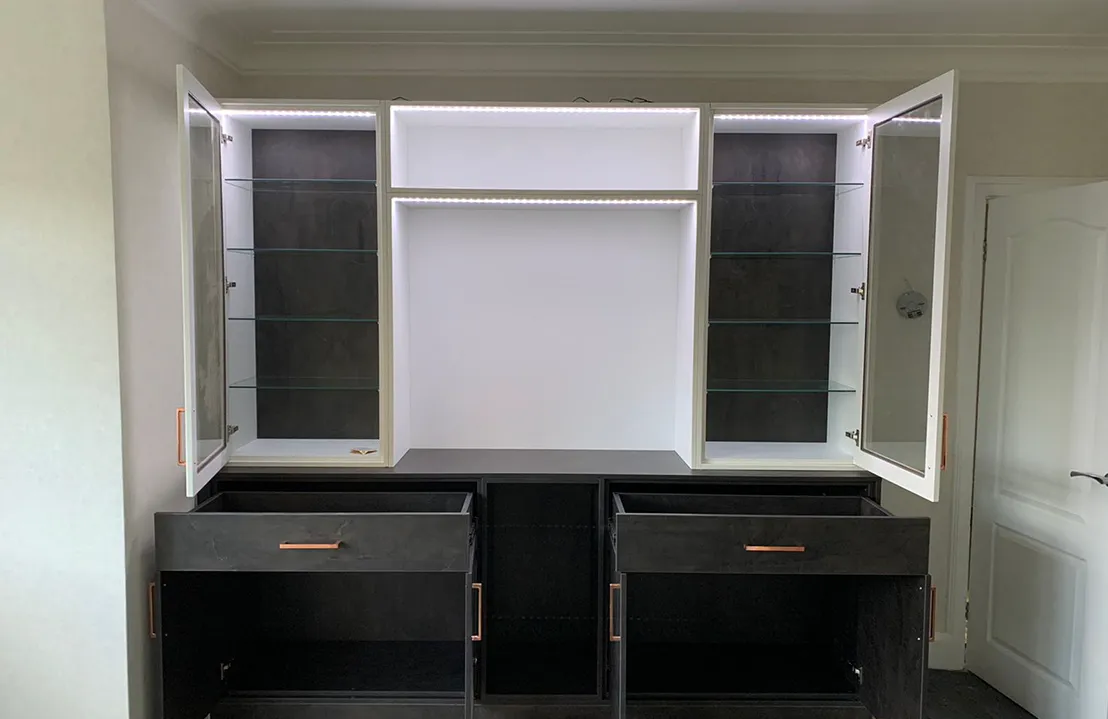 The lower section of this unit is outfitted with drawers and cabinets finished in a silver-grey metallic slate, drawing the eye towards the display unit while providing out-of-sight storage solutions. This modern contrast effect was tied together through the clever customisation of the display cabinet panels. The back panels are finished in the same metallic slate, directing the eye upwards and providing a one-of-a-kind piece that suits the rest of the home.