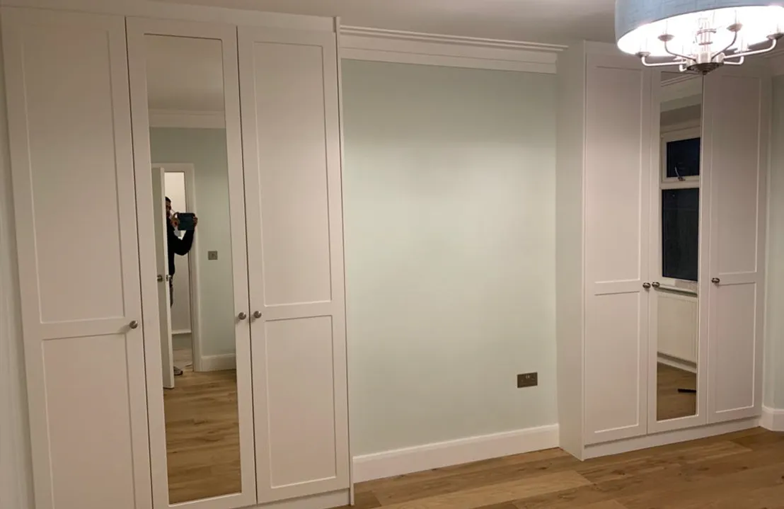 For this bedroom, the customer required a multi-purpose storage solution. They needed something that would match both the style and shape of the room, whilst also providing shelf and hanger space. Our shaker-style fitted wardrobes feature in-built, full-body mirrors. They’re designed to take full advantage of the room’s height to make best use of the space.
