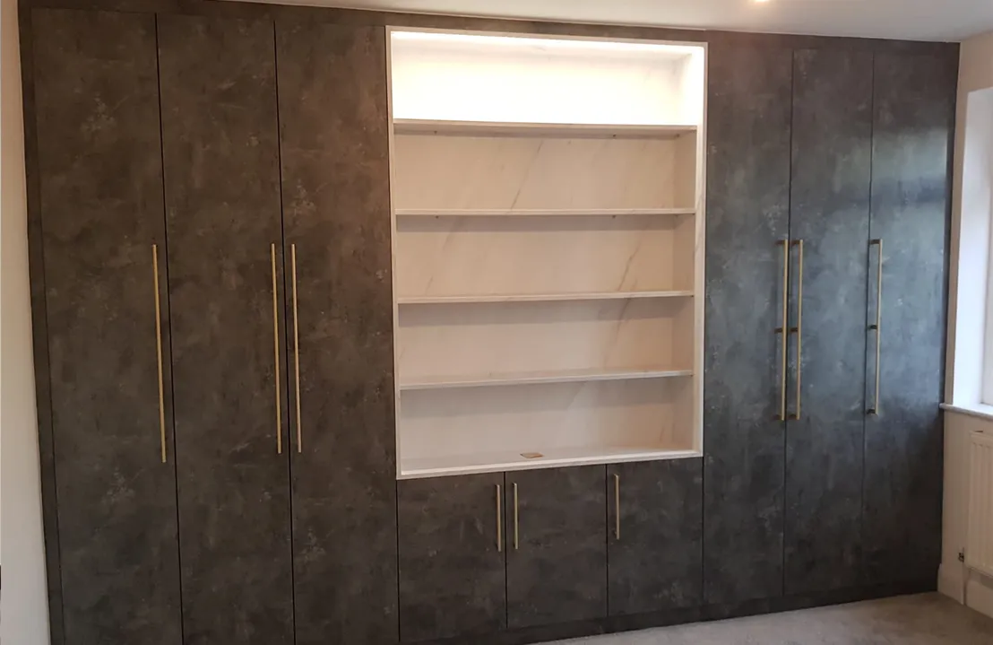 One of our customers in Balham was looking for a better way to utilise the space in their new home. They decided on a hinged door wardrobe covering one wall of the primary bedroom, with a unit of open built-in shelves in the middle. Working with the customer, we created their perfect storage solution, balancing luxury with practicality.